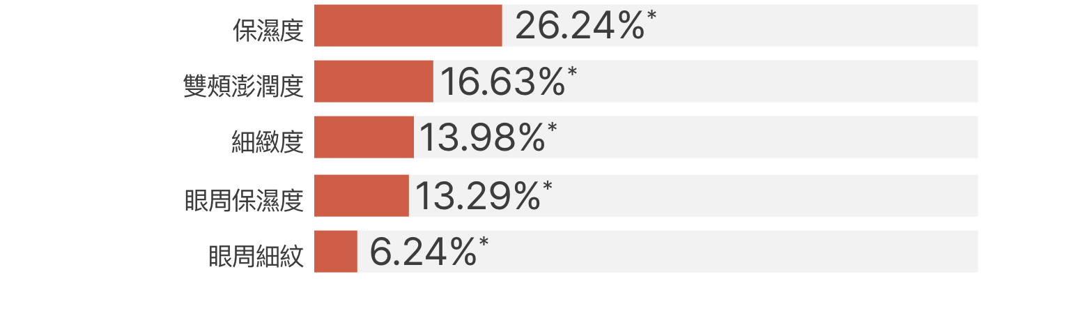 改善膚色均勻4.17%,改善肌膚紋路4.54%,增加肌膚彈性2.15%,提升肌膚透亮0.9%